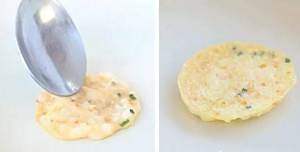 起锅开小火,刷一层薄薄的食用油。用小勺子舀入饭糊。舀入后稍微铺平一点,煎至底部凝固后翻面,前后大约煎3分钟就可以了。