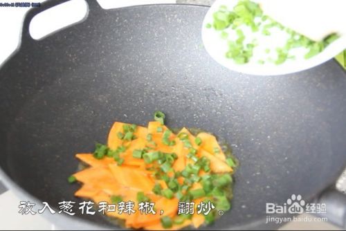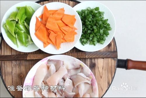 准备好各种材料。把鱿鱼清洗干净,去除内脏,用鱿鱼身做菜。把鱿鱼头放进冰箱冷冻。把胡萝卜和辣椒切成菱形。把鱿鱼板改刀切成花。