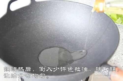 倒掉热水,预热锅。锅烧热后,倒入少许色拉油,转动锅,让油分布均匀