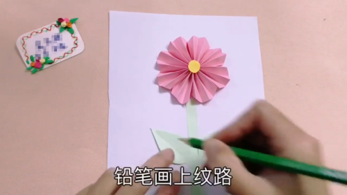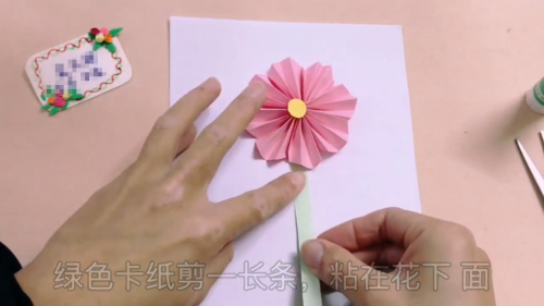 9绿色卡纸剪一长条,粘在花下面。