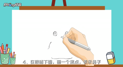 3在眼睛里面各画一个小圆,表示眼里的光,在眼睛下面画一个黑点,表示鼻子,在鼻子下面画一个3,表示嘴。