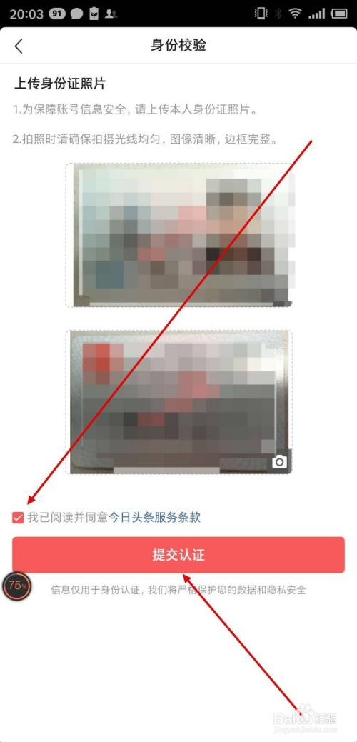 上传身份证件正反面,勾选✔【我已阅读并同意今日头条服务条款】,点击【提交认证】,如下图所示