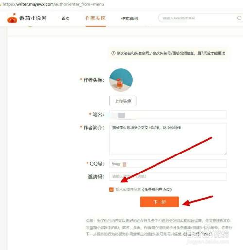 上传头像,填写笔名及作者简介、QQ号等信息后,勾选【我已阅读并同意头条号用户协议】,点击【下一步】,如下图所示
