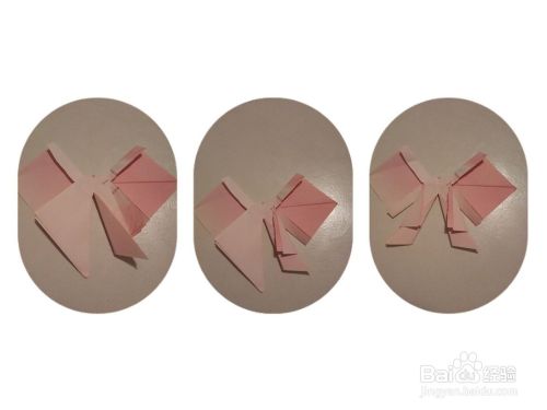 将折纸两侧的正方形沿着对角线向后折,形成两个三角形,将两个三角形的两端插进中间的小正方形里面(如图),蝴蝶结就基本完成