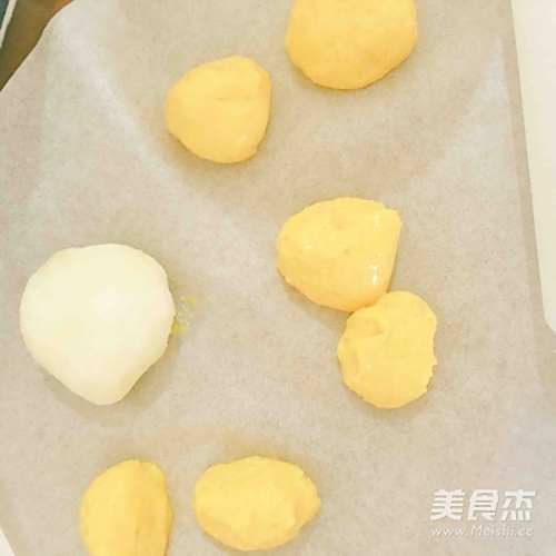 7从冰箱里取出蛋黄馅料分成红枣大小揉成团待用,然后把发酵好的面团分成若干份,撒上高筋面粉,擀成中间厚四周薄的面皮,然后把蛋黄包进去,收口朝下,如最左侧包好的模样!(这个大家都会吧,从小看麻麻包包子看到大的)