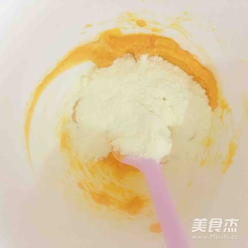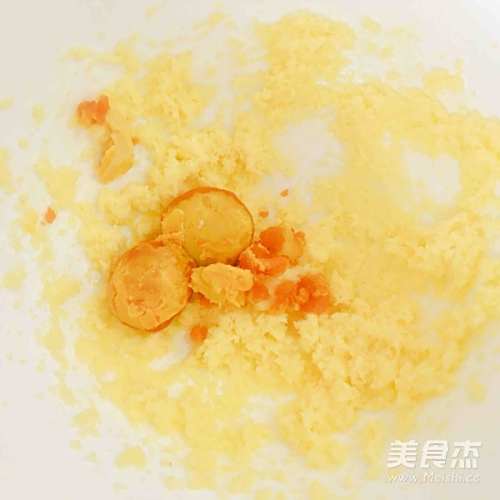 4软化的黄油加入白砂糖搅拌均匀后,加入流油的熟蛋黄(咸蛋黄刚刚煮熟的,一压就成沙状了)搅拌均匀!