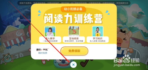 弹出【阅读力训练营】后点【X】,进入【叫叫识字】APP。