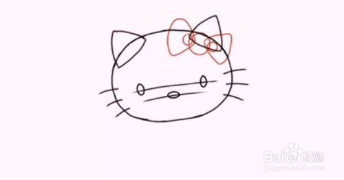 在左耳处,开始画她的丝带。画一个大圆圈,两边画两个小圆圈,把大圆重叠起来。画两个三角形在圆的每一边与弯曲的边。