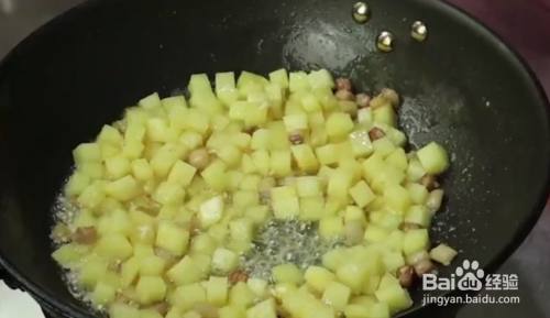 将土豆块放入锅中搅拌均匀,再放入毛豆粒,翻炒均匀。