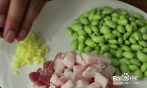 将洗好的毛豆粒放入碗中,五花肉切成片,再切成条,最后切成粒,将生姜和大蒜切成末放入碗中留有备用。