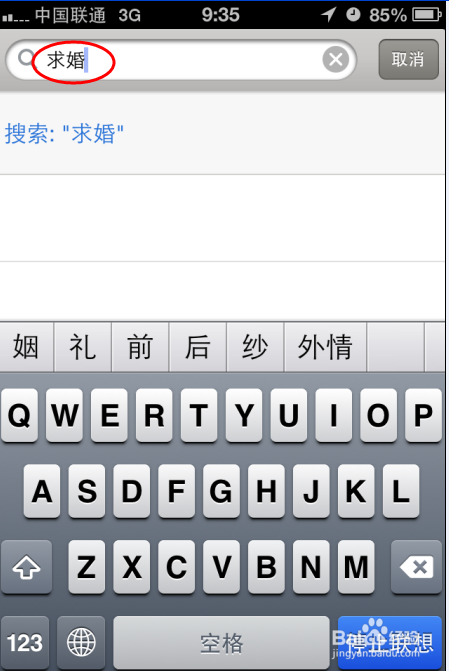 在弹出界面上的搜索框里输入你想要查询的内容比如:输入关键字“求婚”,搜索。