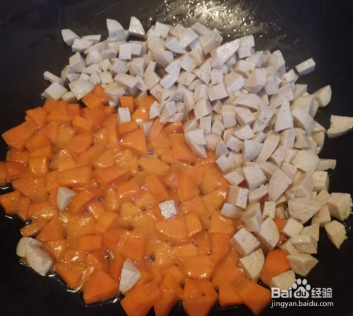 洗干净炒锅,等水份干了倒入食用油,再倒入胡萝卜翻炒。