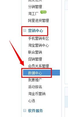 进入自己的卖家中心,然后往下拉滚动条,看到有一个左侧有一个营销中心的栏目,里面有个“数据中心”: