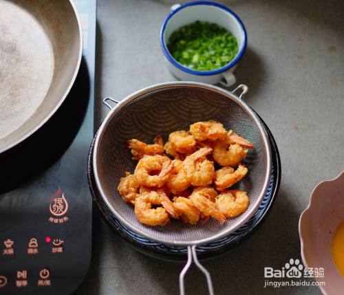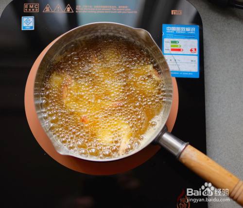 电磁炉选用“匀火”模式,火力600瓦。待锅中的油温到达170度后,放入裹好面粉的虾油炸一下。