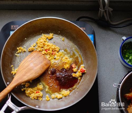 换锅,电磁炉选“炒菜”模式,火力1600瓦,锅热后倒入油,30g左右,倒入咸蛋黄、大蒜、小米椒,炒香后再加入咖喱酱一起炒至起泡泡。