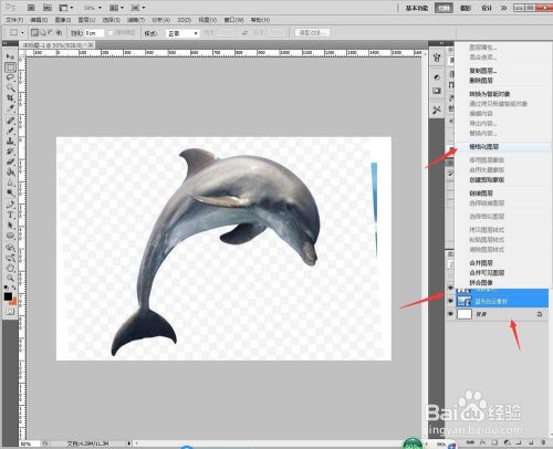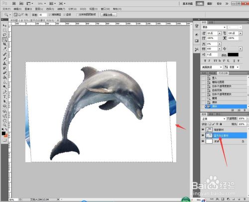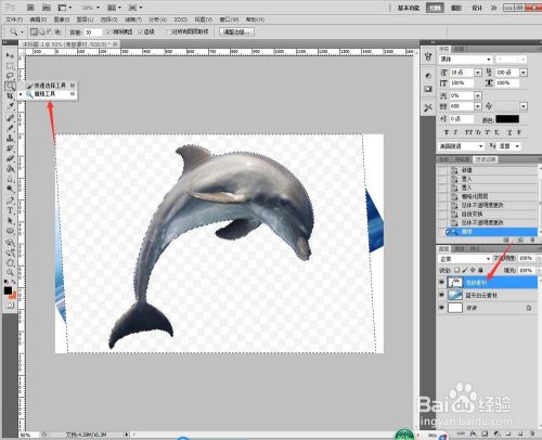 3、将海豚素材的不透明度调回100%,选择【魔棒】,选取海豚背景区域,点击Delete删除背景。