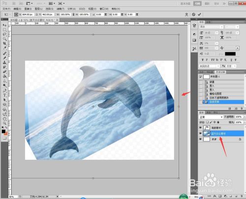 2、将海豚素材的不透明度调浅,然后Ctrl+T选中蓝天白云素材,调整放大旋转布满海豚轮廓。