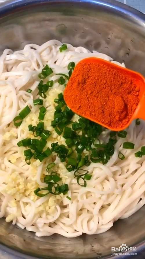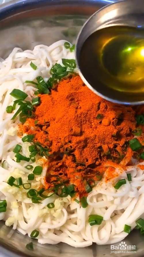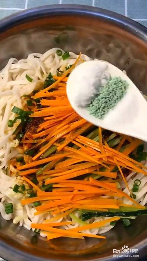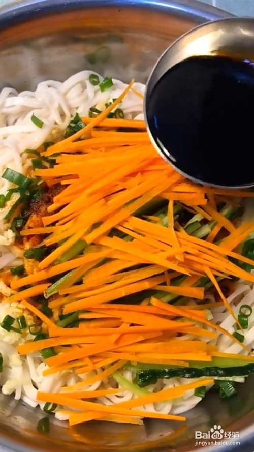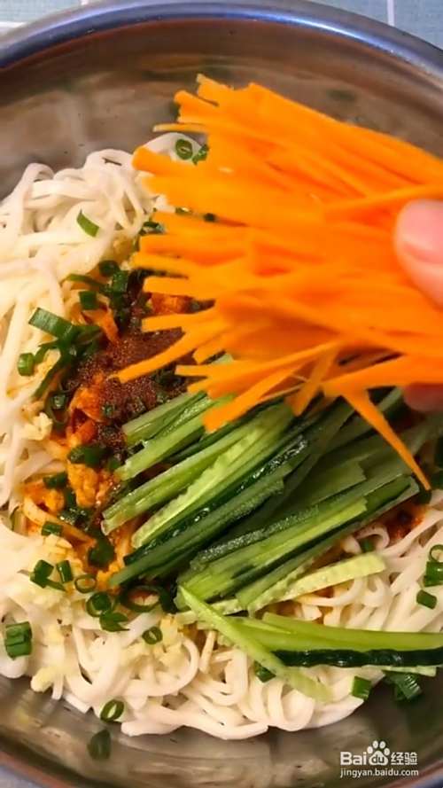 再放入葱花,辣椒粉,浇上热油炸香;再放入黄瓜丝,胡萝卜丝。