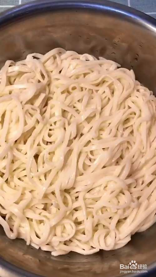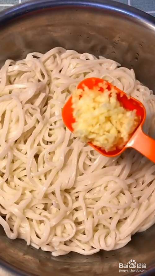 锅中水开,放入面条煮熟捞出过凉水,控干水分,放入盆中;再加入蒜末。