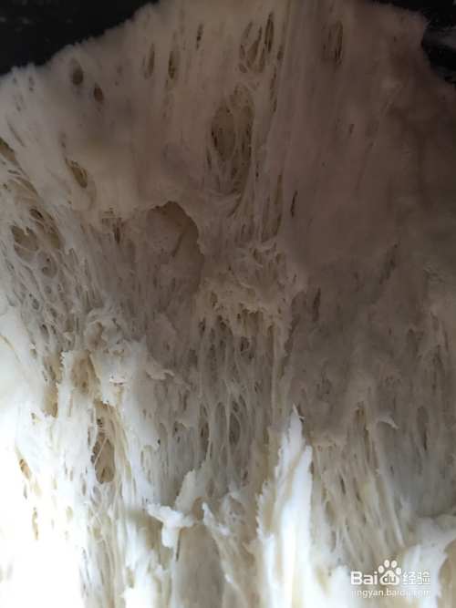 揉成团后盖上纱布大概一个半小时后,面团会变成原来的两倍大,用手撕开面团会是这样的蜂窝状