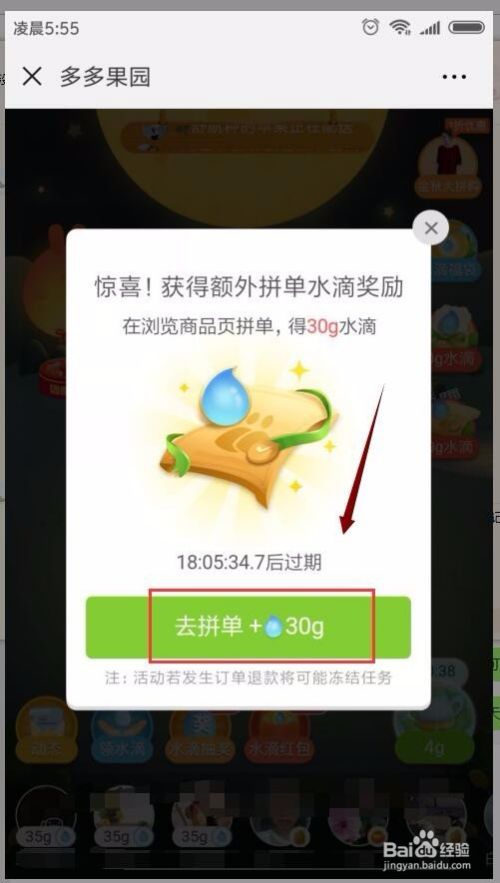 如下打开的是拼单水滴,一般是在逛产品时会出现的;也是在领水滴按钮内有一个:1分钟浏览奖励15g水滴,点击它浏览时会弹出一个页面,获取后的水滴红包会在右侧出现。