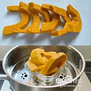 贝贝南瓜去皮,切条,冷水上锅蒸20分钟。