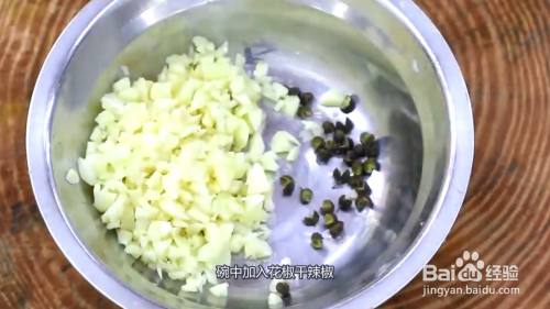 菠菜切好备用,大蒜切碎,碗中加入花椒干辣椒,锅中加入适量的油。