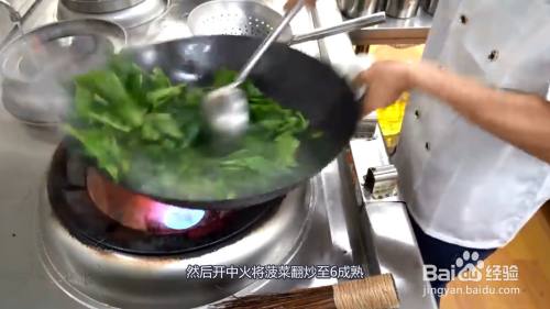 先把配菜切好,然后把配菜放入锅中炒香,再放入菠菜炒6成熟,之后放入调料调味,最后翻炒均匀即可出锅,具体方法如下: