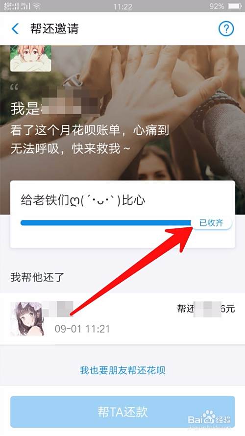最后在【帮还款成功】的界面点击右上角的【完成】就可以了,当金额达到了好友输入的金额,进度条会显示【已收齐】。