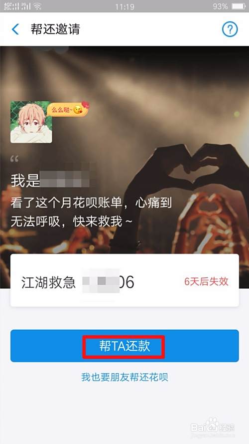 之后,进入到【帮还邀请】的界面,需要点击一下【帮TA还款】的按钮。