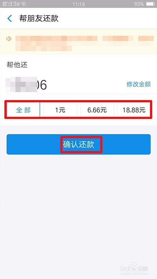 进入到【帮朋友还款】的界面后,选择一个金额或者直接点击【确认还款】的按钮。
