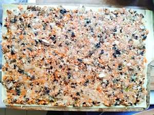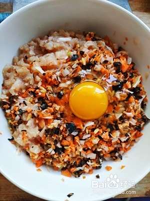 鸡肉和其它配料分别搅碎,放入碗中,打蛋,加料酒、生抽、蚝油和盐,然后均匀搅拌。