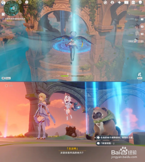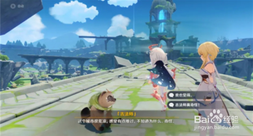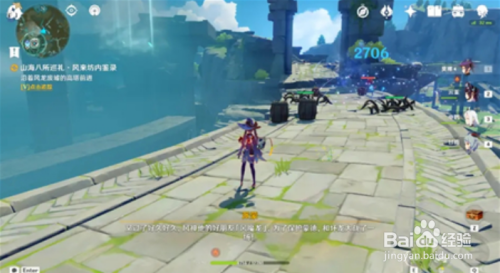 接下来按照以前来完成风魔龙任务时的路线一点点向废墟塔楼前进,路上旅行者和派蒙尝试给吉法师讲述风魔龙特瓦林的故事,吉法师聪明的联想到璃月的仙人。注意路上会遇到丘丘人杂兵,可以无视也可以轻松干掉。