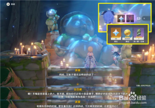与五百藏对话,发现“妖狸饭”的效果消失了,吉法师的话又无法理解了,就经由五百藏翻译出来了。结束对话,获得30原石+2万摩拉,然后再进入活动界面,领取最后的奖励:3万摩拉,4星经验书x2,摆设【伪一郎·石像】(古代大妖狸的石像),全部完成。