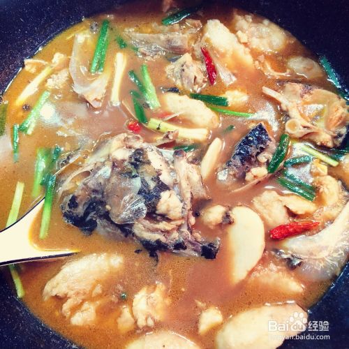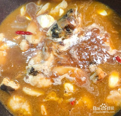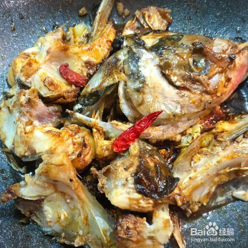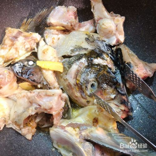 在锅里,把油(菜籽油)放入姜片,整颗蒜末压碎,然后把鱼头放入锅中煎两片金黄边