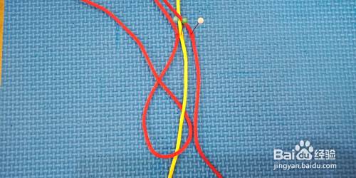2、取左边的一根红绳子从上面穿过中间的黄色绳子