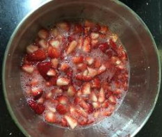 草莓洗干净以后用刀切成小块,形状无要求,不要切太大。放进赶紧的盆里。