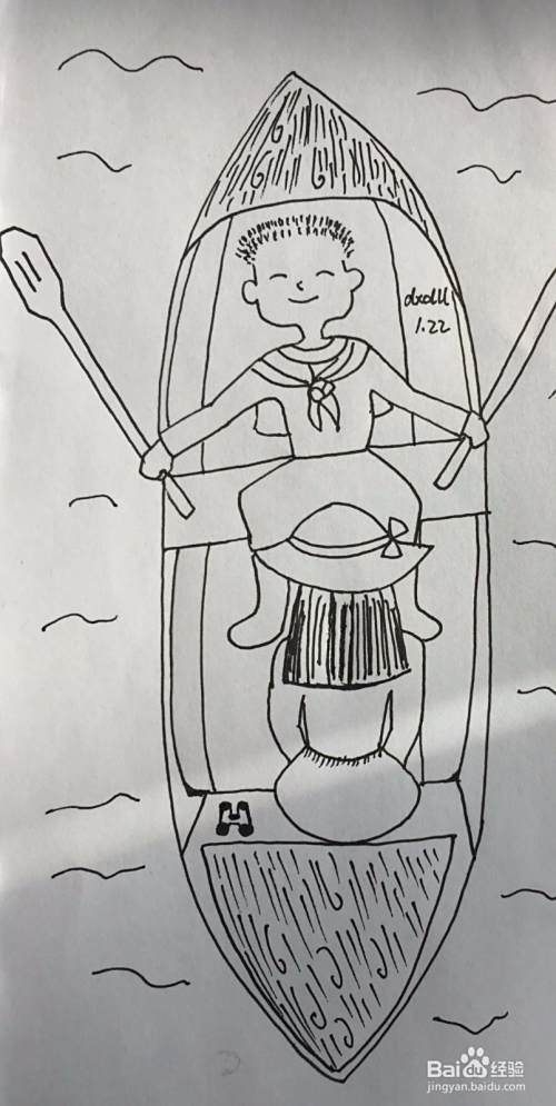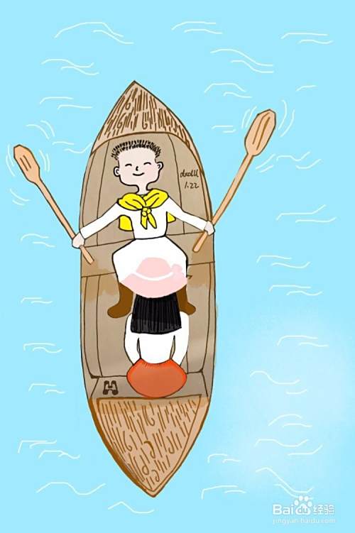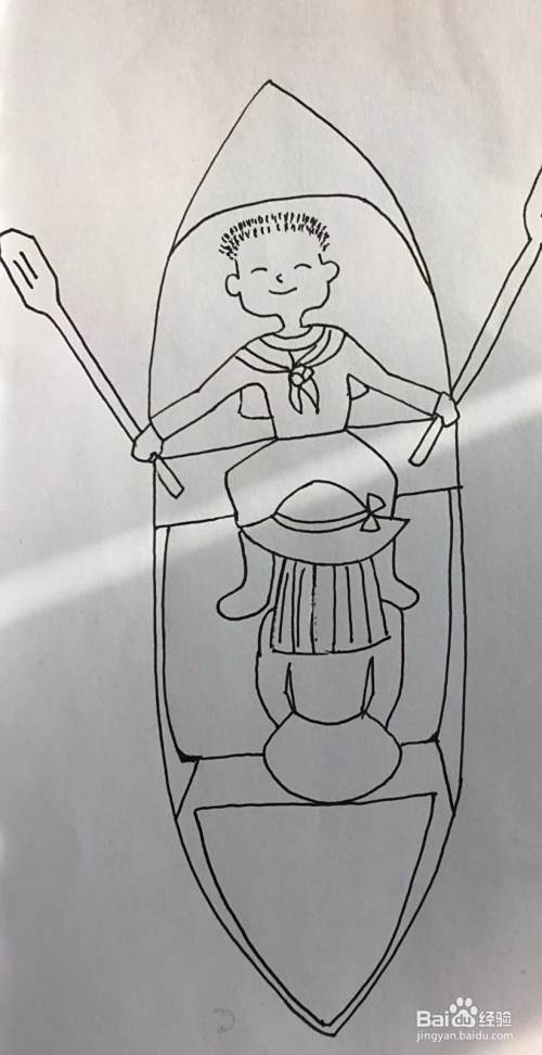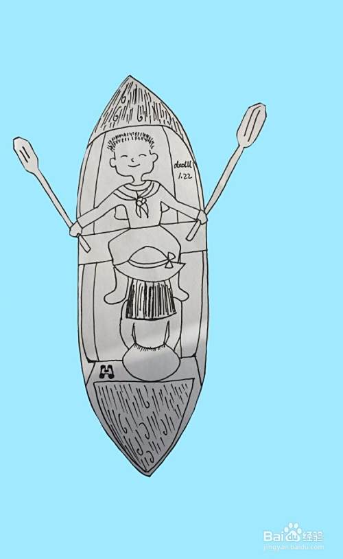 用笔画出船的轮廓,在男孩双手两侧画出船桨。在船桨两端画出木质纹理,具体画法可参见下图。