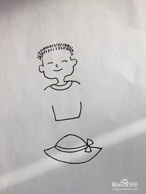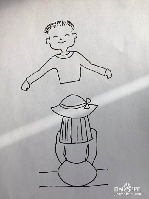 首先在白纸上,用笔画出男生的头部。给男生添加五官,男生脖颈线条下沿画出上半身。用笔画出女生的帽子、长发、手臂和服装。