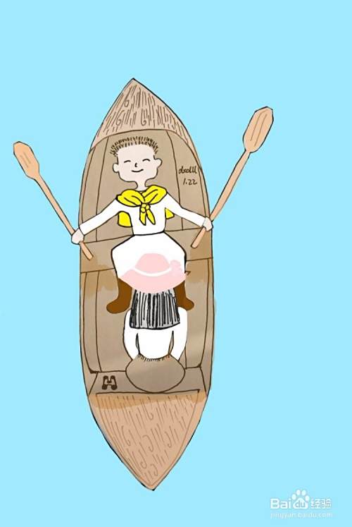在女生左侧画出望眼镜,船外画出湖水的波纹。蓝色水彩给湖水上色,米色水彩给船头两侧上色,白色水彩给衣服上色。黄色水彩给男生的披肩上色,粉色水彩给女生的帽子上色。
