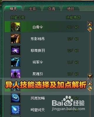 技能:白骨令: 异人最初的宝宝,也是点击其他宝宝技能的基础,前期常用,后期用处不大(尤其75级出了石头以后)。