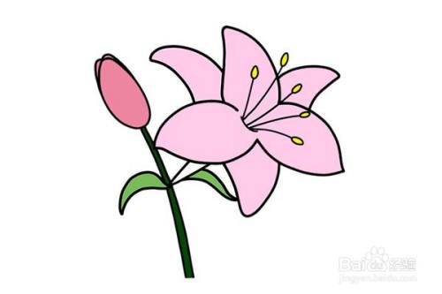第五步:画好之后,给百合花涂成粉色,花骨朵可以深一些,枝叶涂成绿色。这样一幅百合花的简笔画就完成了,简单又漂亮。