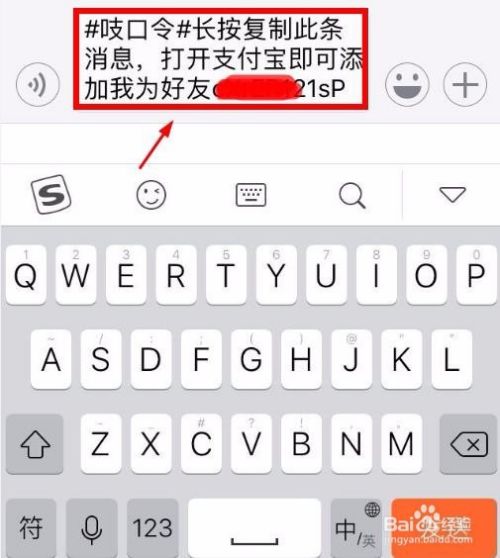 我们以微信粘贴为例,点击刚才的"去微信粘贴"以后系统会自动切换至微信界面,在聊天窗口输入框将吱口令粘贴发送给好友,对方看到以后复制这段口令打开支付宝即可添加我们;