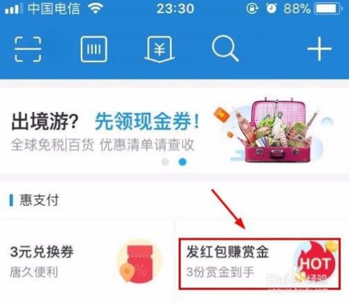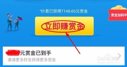 ①在支付宝首页的中间位置找到"发红包赚赏金"链接,如图;点击进入以后可以看到该活动的详情,我们点击页面中的"立刻赚赏金"