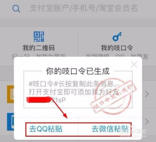 ②接着在添加朋友页面会显示"我的吱口令",点击以后会随机生成一个吱口令,我们只需选择去QQ粘贴还是微信粘贴就可以了,如下图...