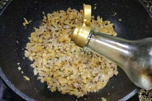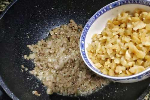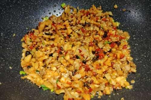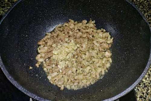 2适量油加热,放入猪肉翻炒变白色,肥肉稍微煎出一点油。然后倒入蒜蓉爆出香味。