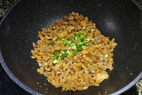 不辣的做法:直接撒葱花翻炒均匀即可出锅。这个不辣的萝卜干可受桐爸喜欢了,还经常打包拿去公司吃饭用。 -