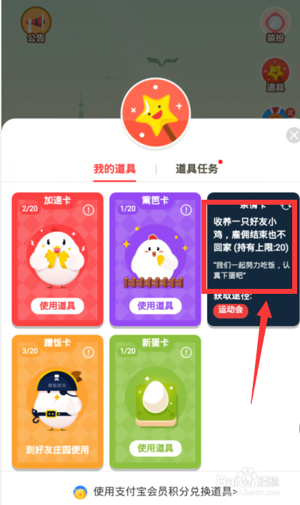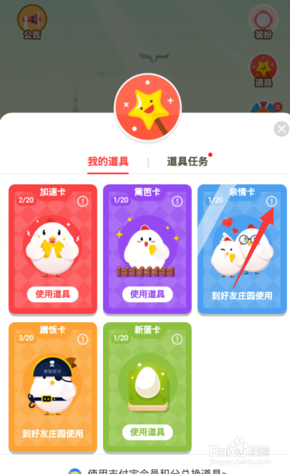 支付宝蚂蚁庄园亲情卡可以收养好友的小鸡。