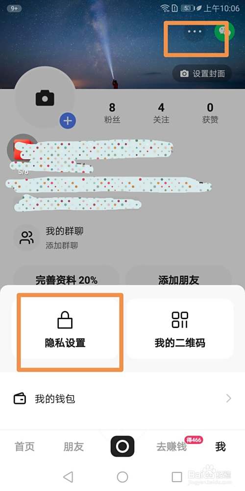 进入界面,接着点击屏幕右上角的【三个黑点横线】,会弹出一个方框,方框中 点击【隐私设置】,进入隐私设置界面。