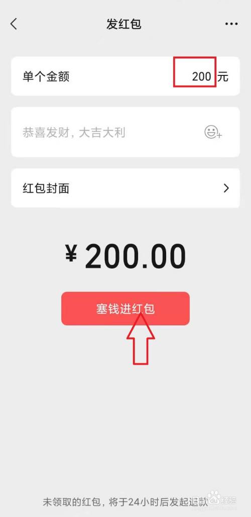 在单个金额中输入数字"200"(这是红包的最大数额),然后点击"塞钱进红包"选项,接下来按照页面提示就可以发送红包了。